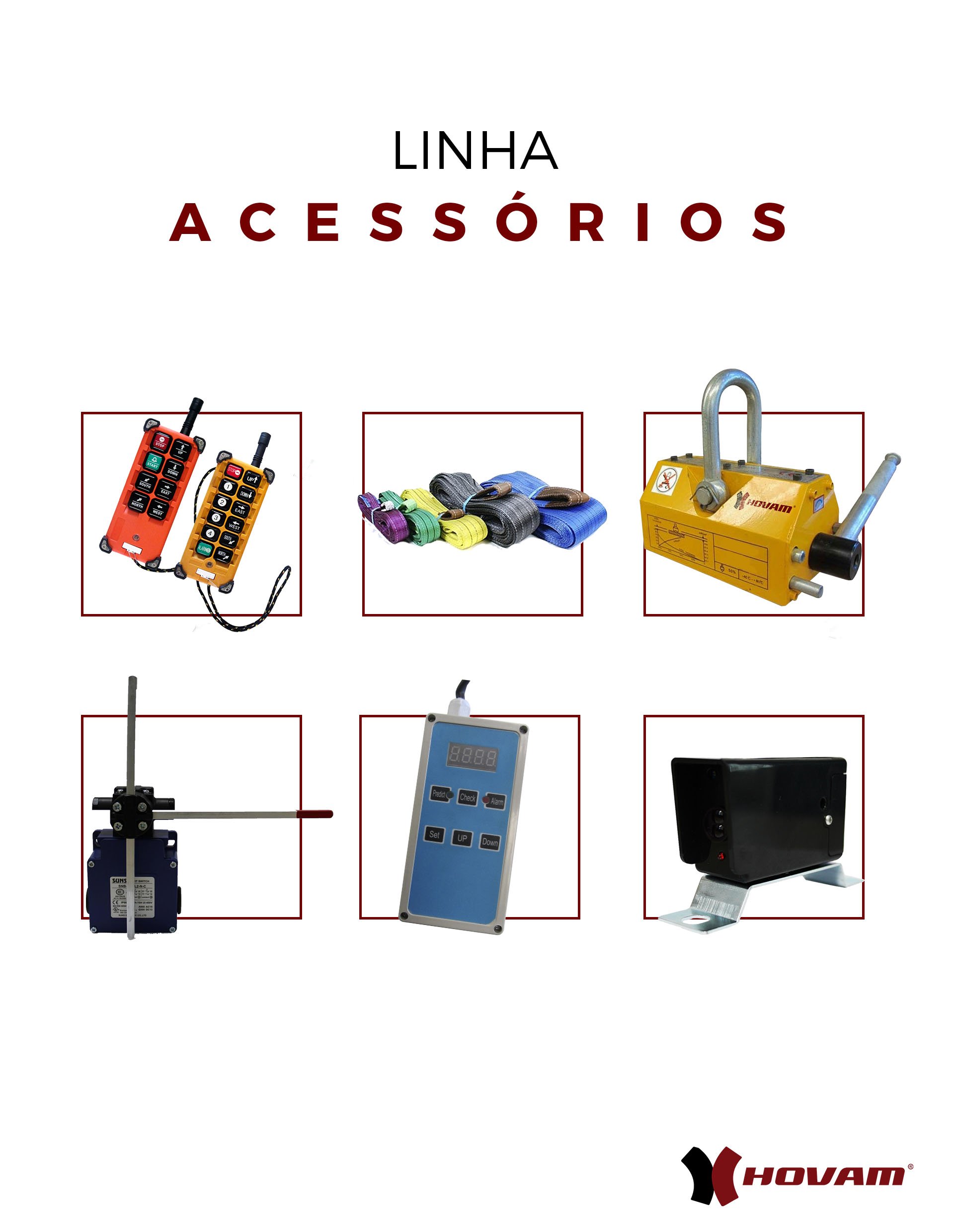 Dentre os acessórios em destaque, está o controle remoto para Talhas Elétricas, Pontes Rolantes e Pórticos.